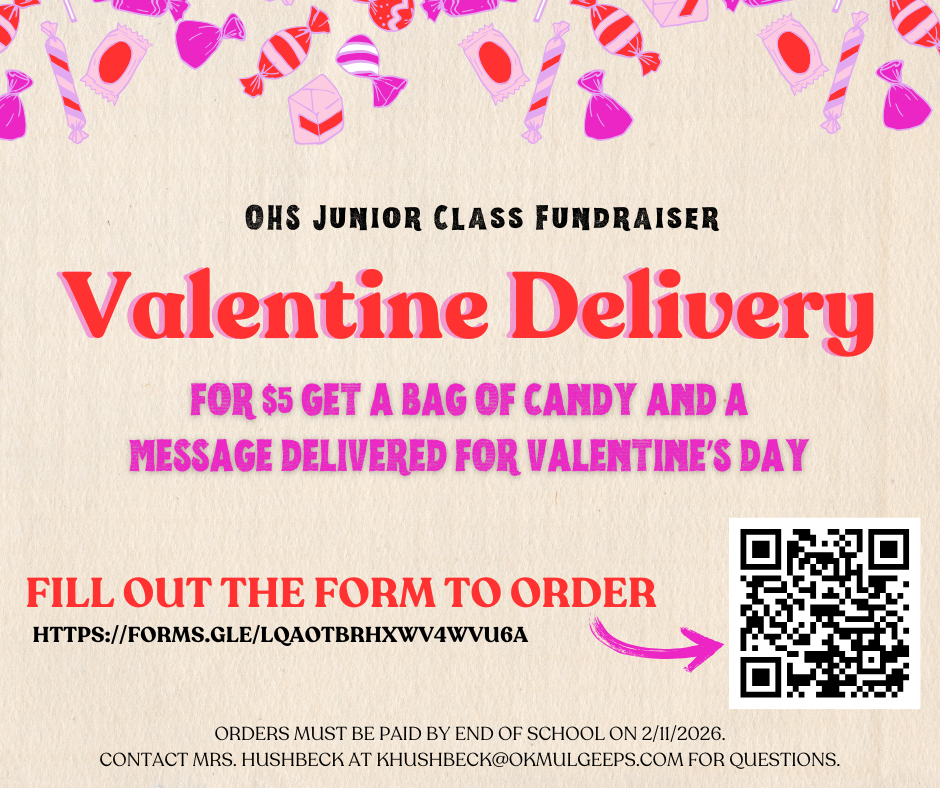 Order your Valentine to be delivered on February 13th! https://forms.gle/jMLz6GKAuh8MpJGF7Support Okmulgee's Junior Class and order by February 11th!